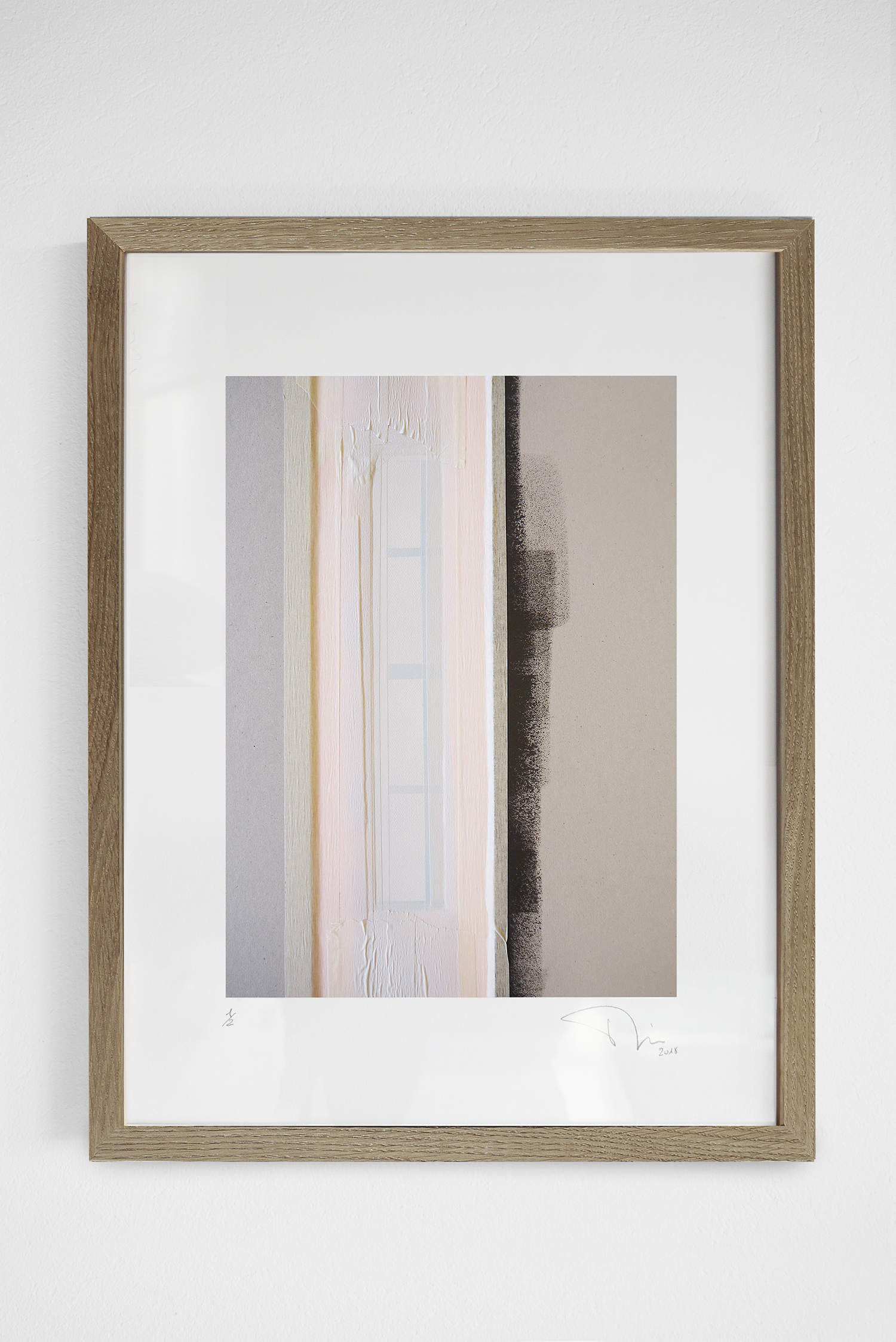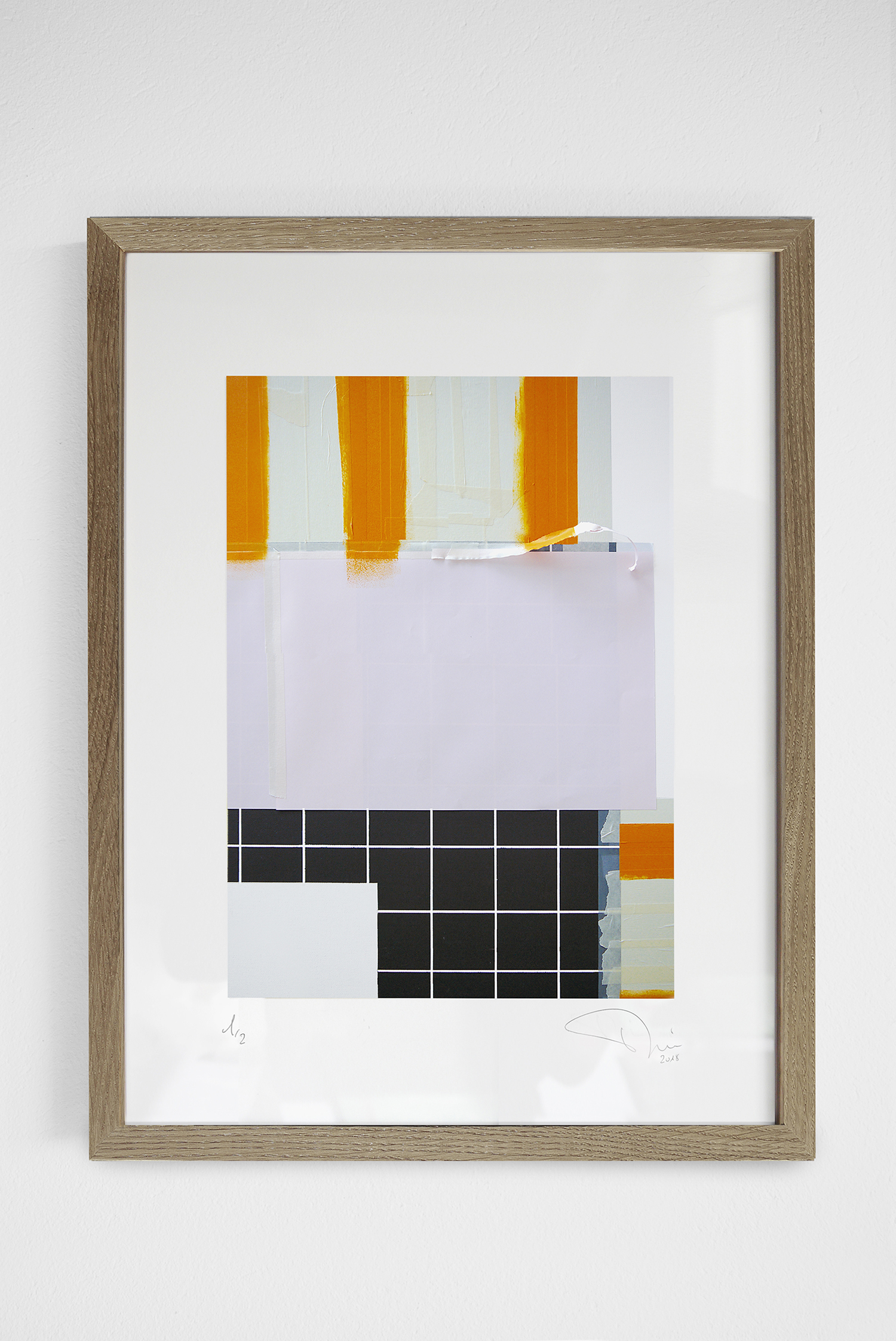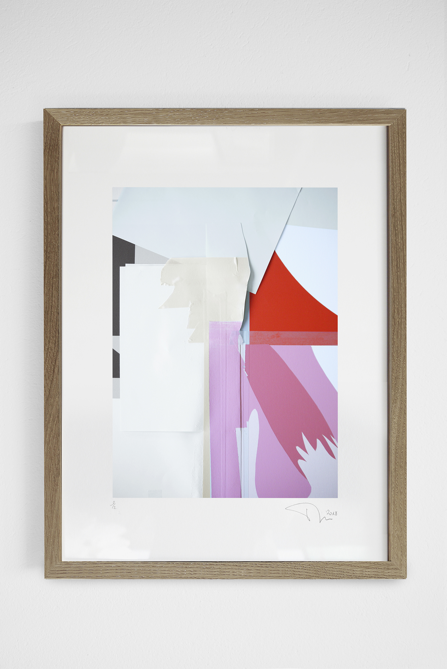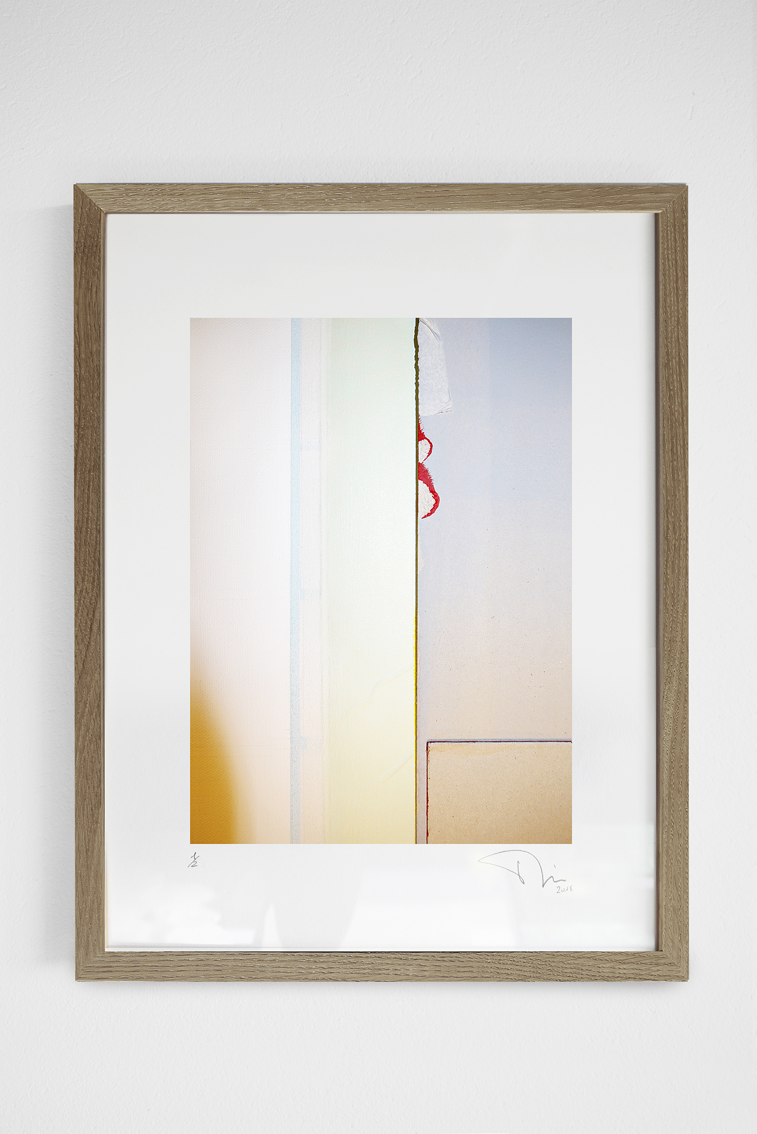 An ongoing photographic series on spontaneous formal compositions which appeared during the process of producing paintings on canvas. But unlike other pieces, these ephemeral situations have never been planned and have been purely caused by chance and "collected" photographically by the artist before their imminent demise. However, this limited series is not to be considered as a documentation or ”making of" but as a distinct project. Each photograph was carefully printed in 2 unique copies with pigmented inks on Hahnemühle FineArt (100% cotton) archival paper. Signed and numbered 1/2 or 2/2 on front side. Mounted under glass and fixed in a natural oak frame, delivred with a certificate of authenticity (COA).