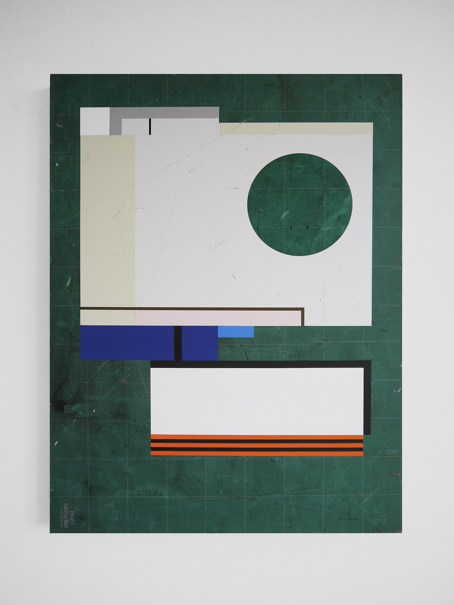 The cutting mats used for these pieces of art were carefully selected from an extensive collection, all originating from former art classes where they served as tools for student projects. The marks of use—deep cuts, paint residues, glue stains, notes, and scribbles—reveal years of creative work by numerous art and design students. What remains important is that the mats were never valued for their aesthetic appeal; they are simply imprints of a creative process.Years of use have left a distinctive patina on the mats, transforming them into more than just backgrounds for further processing. At this point, their imperfections and randomness engage in a dialogue with a meticulously planned graphic composition, implemented as a unique layer on top. But which layer conforms to the other? Which must adapt? Is it the imperfect, randomly shaped patina that submits to the carefully planned design, or vice versa? Does the graphic conceal the accidental work traces developed over the course of time?