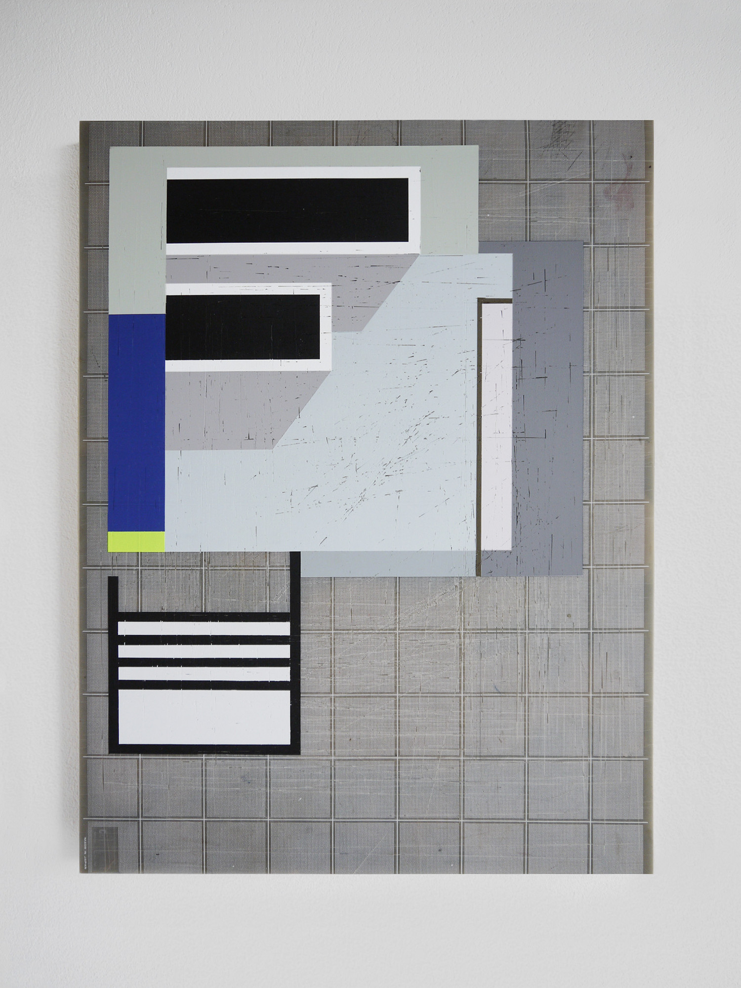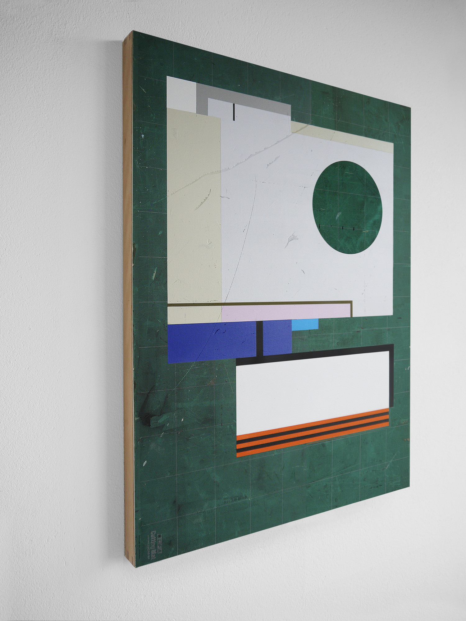 The manually applied acrylic composition, combined with the wooden structure, emphasizes the handcrafted nature of the artwork. No longer lying flat on a table, the cutting mat now exists as a vertically hanging object, drastically altering its existential purpose and redefined contextual appearance.