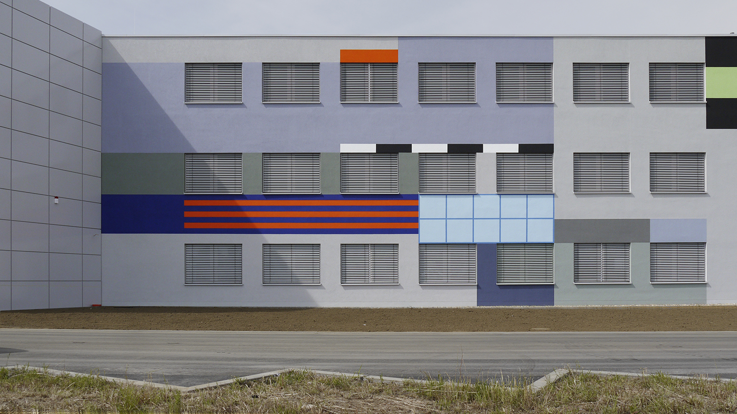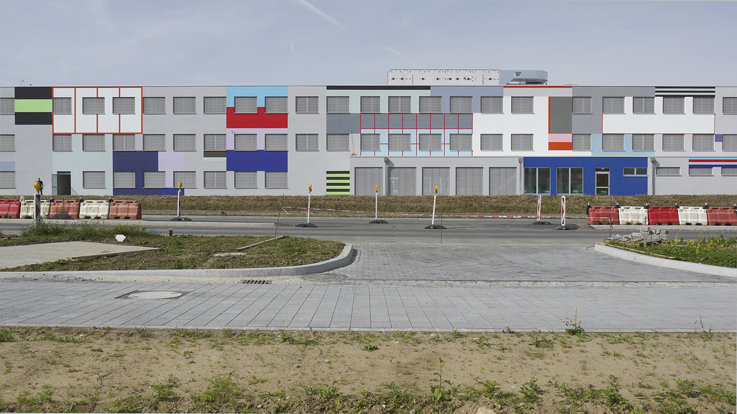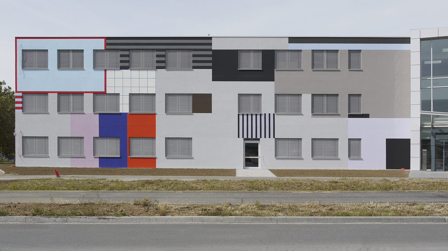 Original graphic design for the facade of the Jean-Monnet T Building, a temporary set of offices made available to the European Commission in Luxembourg-Kirchberg. The construction, based on a functionalist assembly of shipping containers, is like a long and narrow geometric envelope. The Idea was to superimpose on the already existing standardized precast frame, a graphic and chromatic grid that invites a symbolic reading. From the multicoloured world of shipping containers to the geometry of the flags of nations, from the Hippodamian Plan to communication networks, the geometric language of Global Village describes the structures of contemporary social reality. Resembling an urban neighbourhood, a network of agglomerations, Global Village lends a rhythm to the space of the European district and creates visual references in the grey prefab.