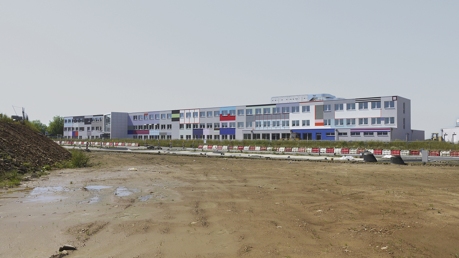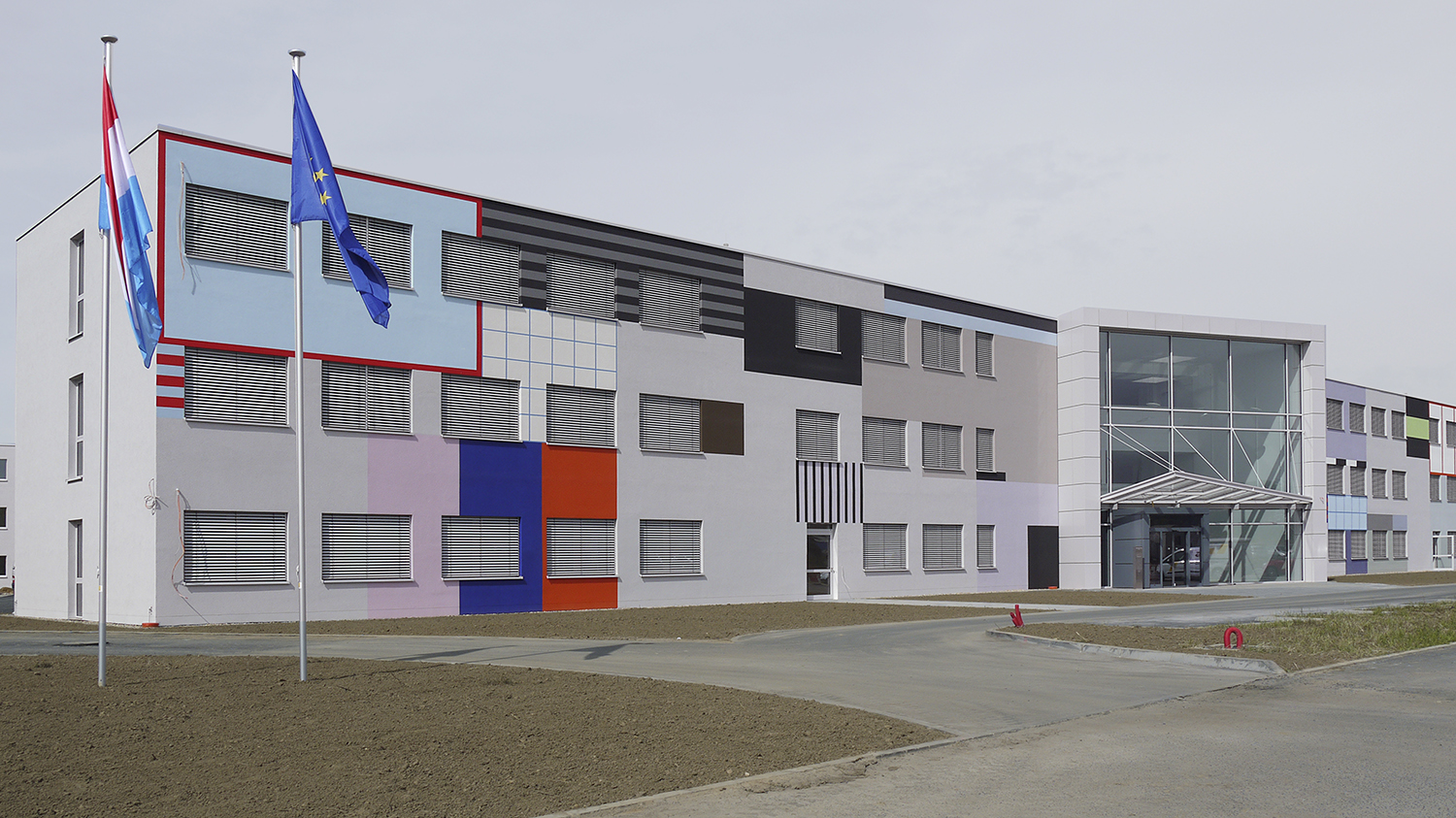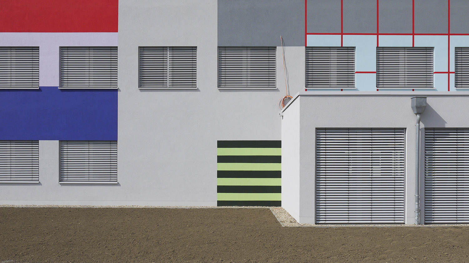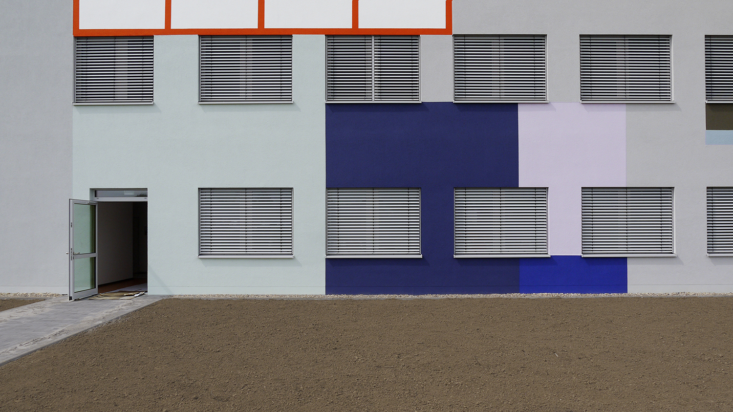 Original graphic design for the facade of the Jean-Monnet T Building, a temporary set of offices made available to the European Commission in Luxembourg-Kirchberg. The construction, based on a functionalist assembly of shipping containers, is like a long and narrow geometric envelope. The Idea was to superimpose on the already existing standardized precast frame, a graphic and chromatic grid that invites a symbolic reading. From the multicoloured world of shipping containers to the geometry of the flags of nations, from the Hippodamian Plan to communication networks, the geometric language of Global Village describes the structures of contemporary social reality. Resembling an urban neighbourhood, a network of agglomerations, Global Village lends a rhythm to the space of the European district and creates visual references in the grey prefab.