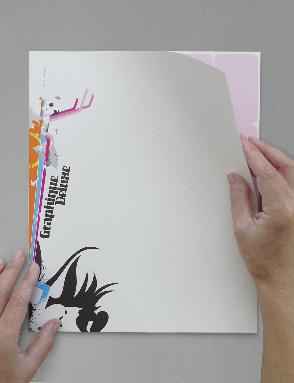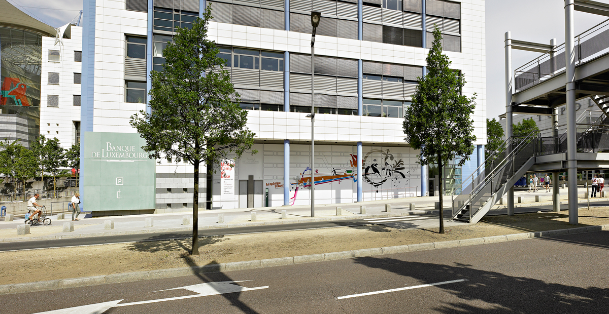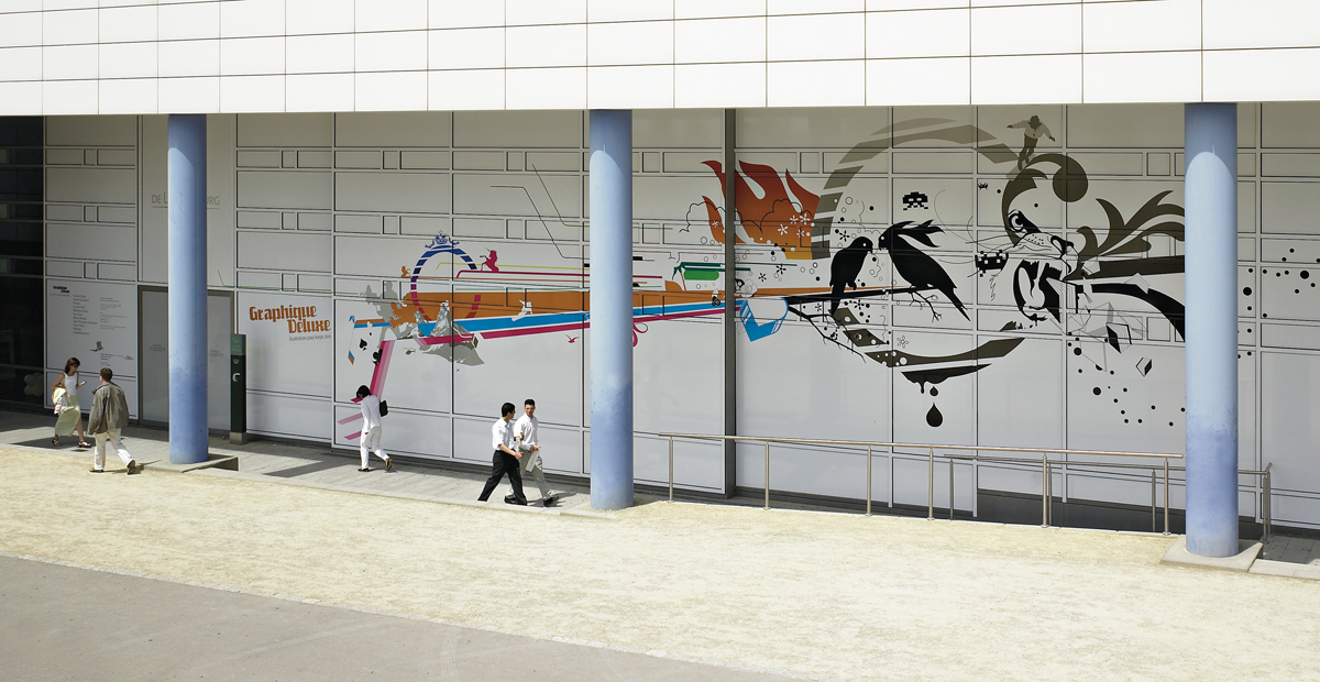 Monumental illustration on the large window front of the Banque de Luxembourg building (Luxembourg-Kirchberg). The artwork was the main visual for a larger exhibition about graphic design which took place in summer 2005 in Luxembourg. A modified part of the illustration was also used for the graphique deluxe invitation poster and catalogue cover.