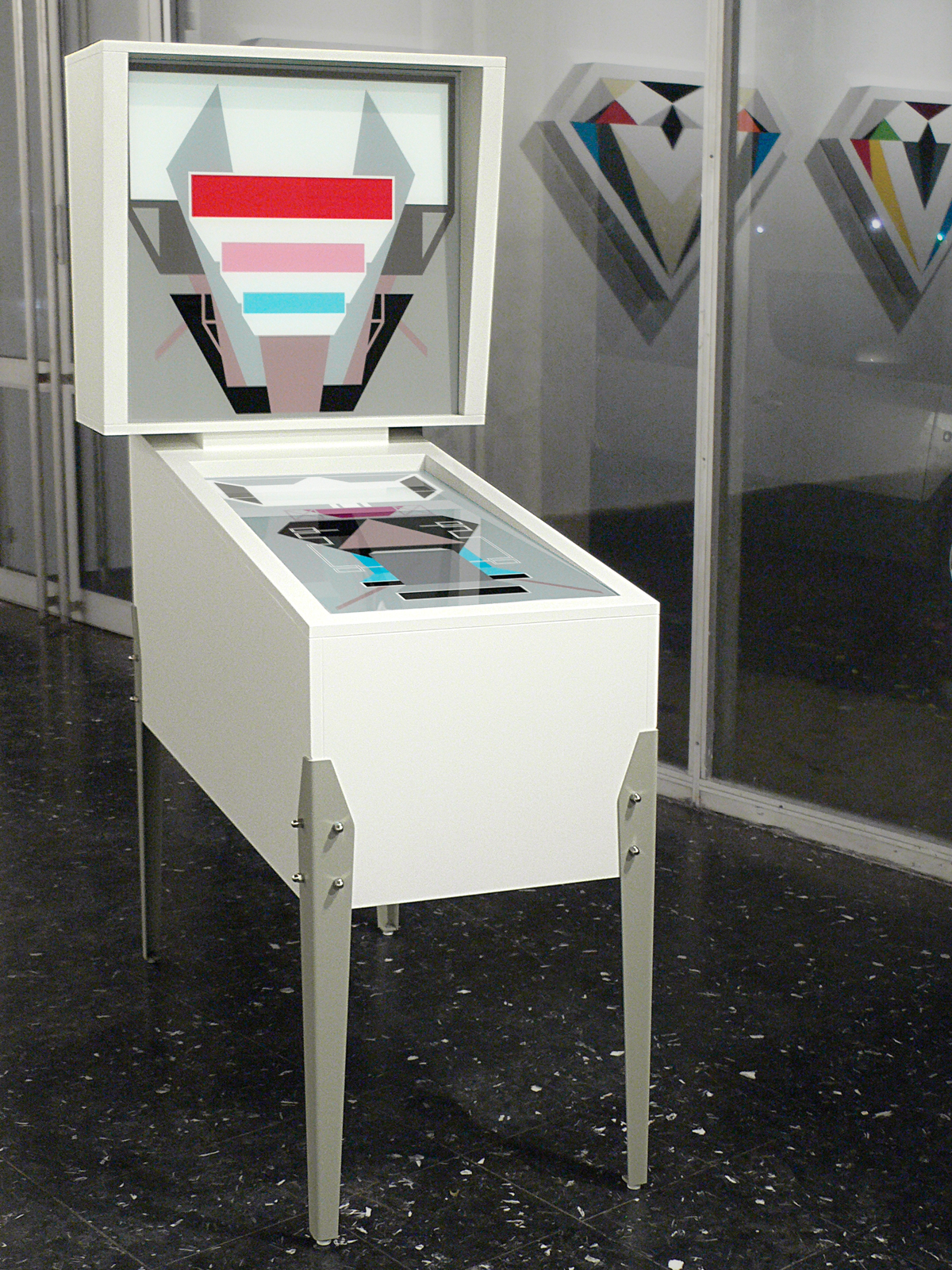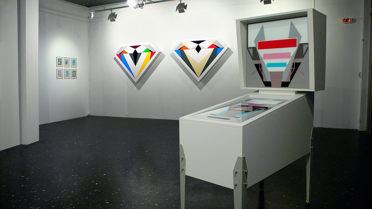 High Score is a reinterpretation of a pinball machine that plays on all the nuances of the "replica", from faithful reproduction (using original materials) to purified distancing: architectural schematization, graphic abstraction of the lay-out and avoidance of all narrative, visual and sound overload. High Score was first presented together with diamonds and duochrome during the "Prix d'Art Robert Schuman" exhibition in november 2009 in France. In 2010 High Score was integrated in the "Ceci n'est pas un Casino" group show held at the Casino Luxembourg - Forum d'art contemporain. From November 2010 to February 2011 the artwork was on show at the Villa Merkel in Esslingen, (D).
