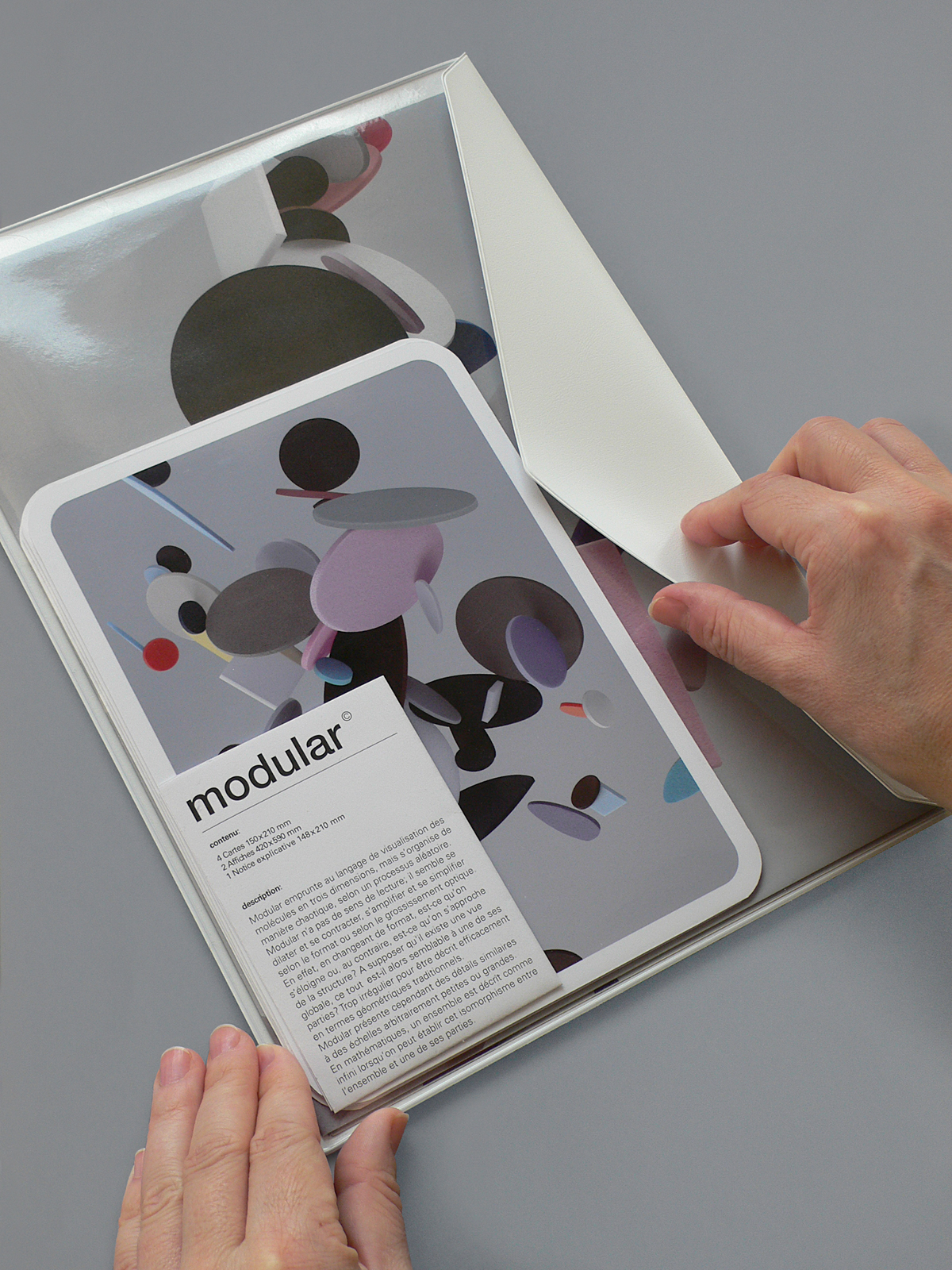 Modular adopts the language of 3D molecular visualisation, but is arranged in a chaotic way, according to a random process. A precise definition which explains nothing, an absurd juxtaposition, an invitation to the pleasure of reflection, reflection on focal reduplication. Modular consists of various offset printed items collected in a special manufactured plastic sleeve. Modular is commissioned by the Musée d'Art Moderne Grand-Duc Jean (Mudam), Luxembourg, and produced as a limited edition.