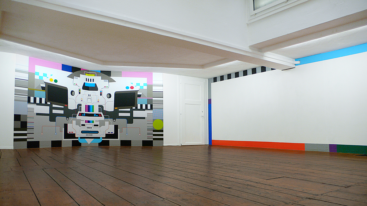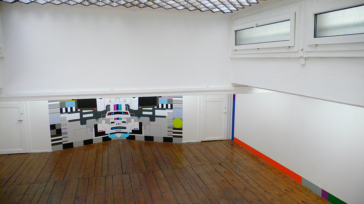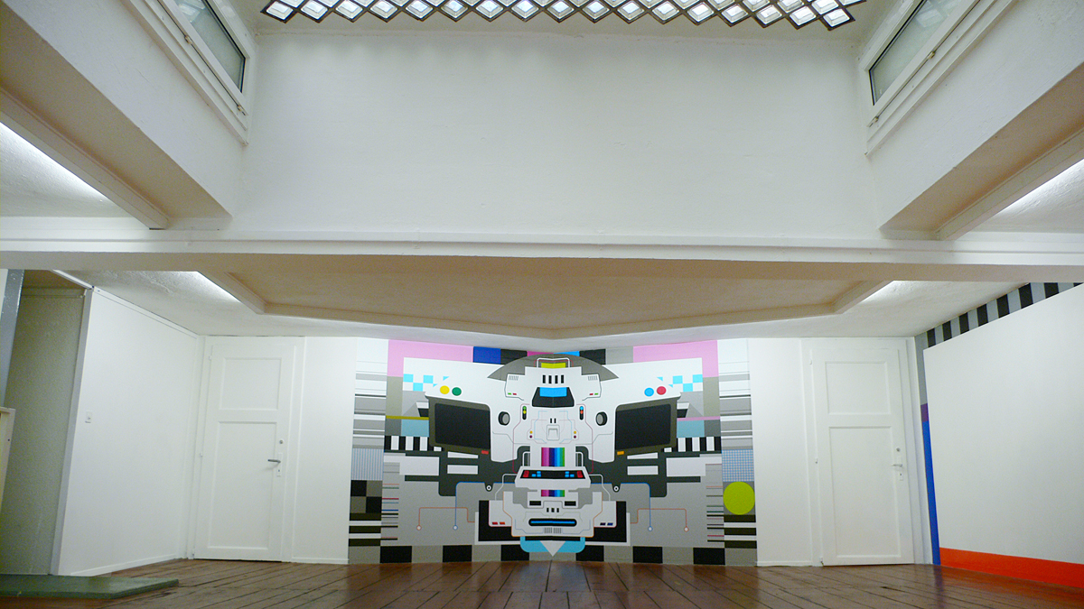 Solo exhibition at Basta - Espace d’Art Contemporain Lausanne, (CH). Mother, a maternal figure in the technological world, makes direct reference to the huge archaic computers of the 1980s with the numerous flashing command buttons (Albator, Star Trek, Goldorak) and to artificial intelligence. Auto-adhesive vinyl on wall.