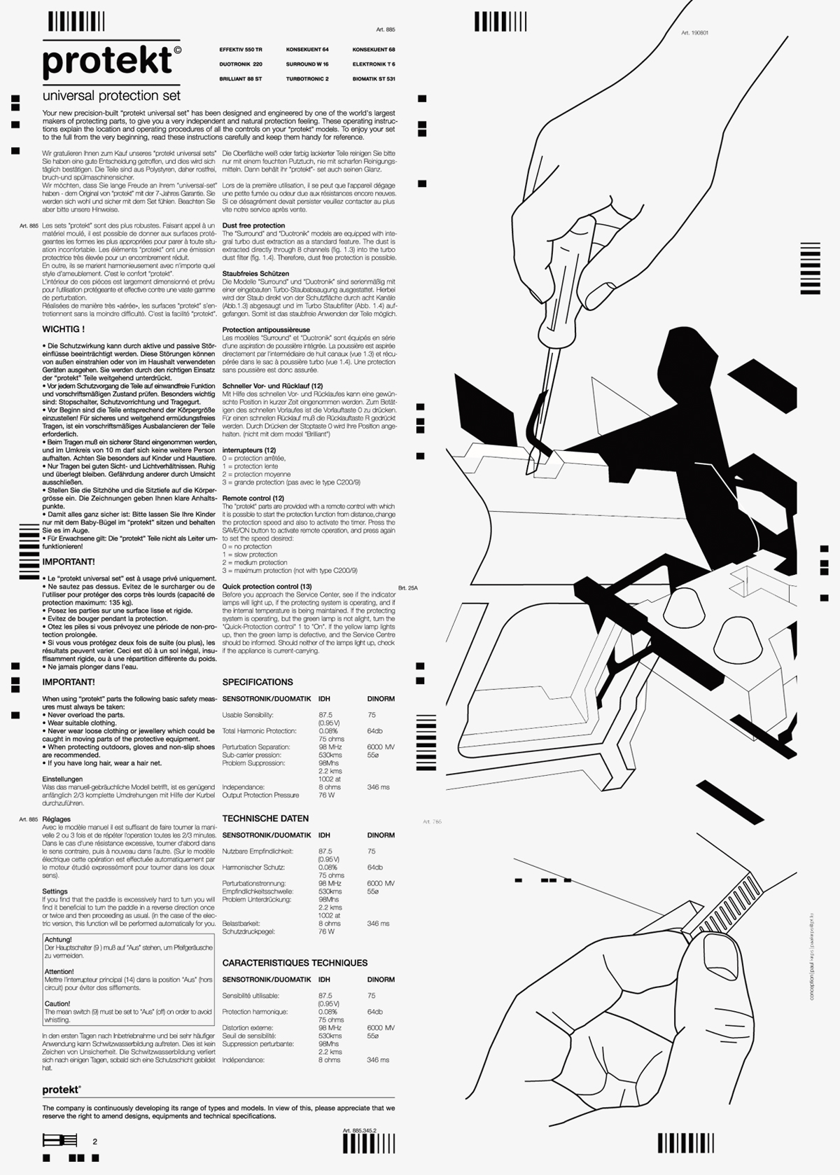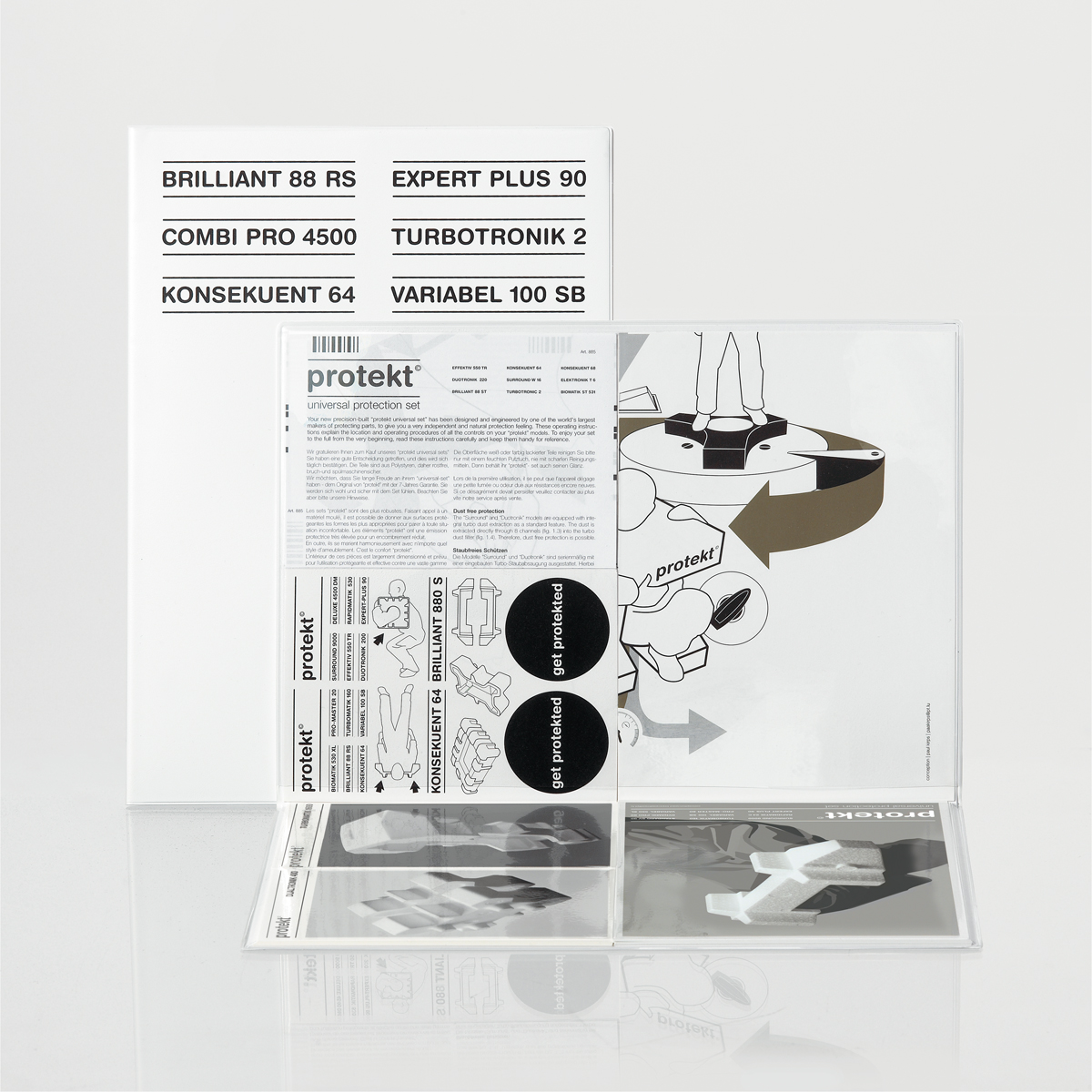 Limited edition of 300 issues /separately numbered (offset/silk-screen printed). Edited by Paul Kirps, Protekt was part of the “safe-design takes on risk” exhibition which took place in October 2005 at the Museum of Modern Art in New York. Protekt is also part of the MoMA's permanent design collection and the "Graphische Sammlung" at the Museum für Gestaltung in Zürich.