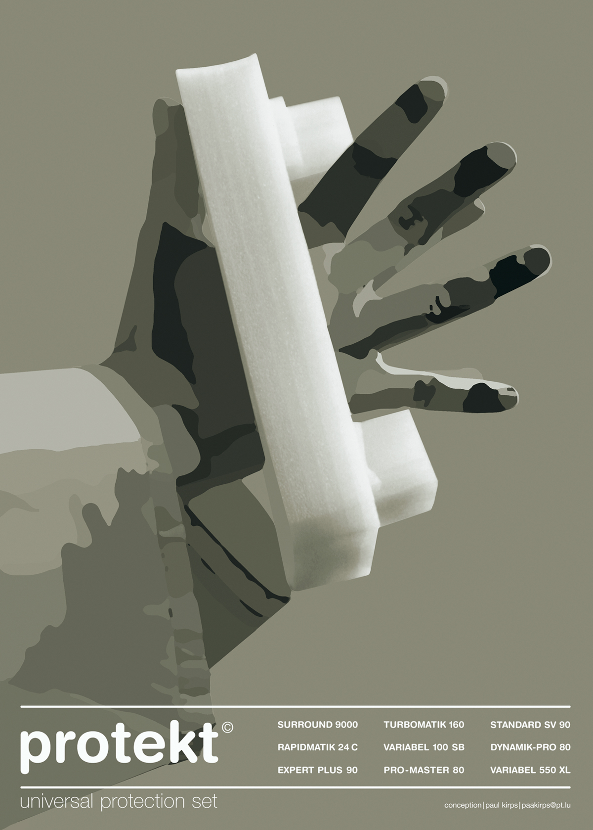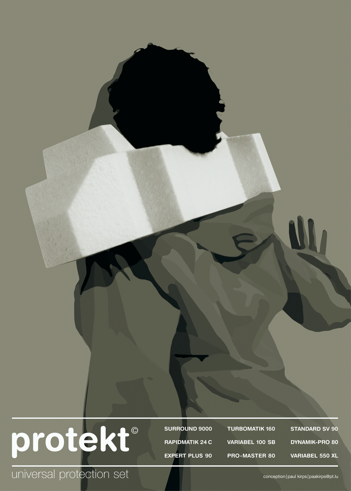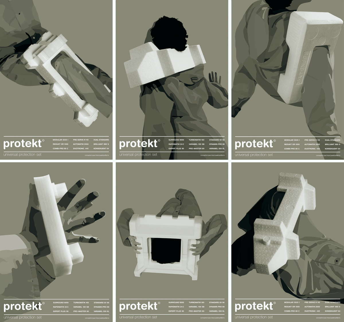 Protekt offers a multifunctional protection set which is concerned about our daily fears and worries. The proposed products and their variations are fictive or extracted from their normal environment. Protekt is the accidental result due to the mixture of a pharmaceutical remedy and a useless household appliance.