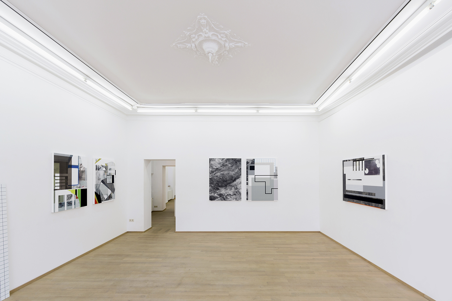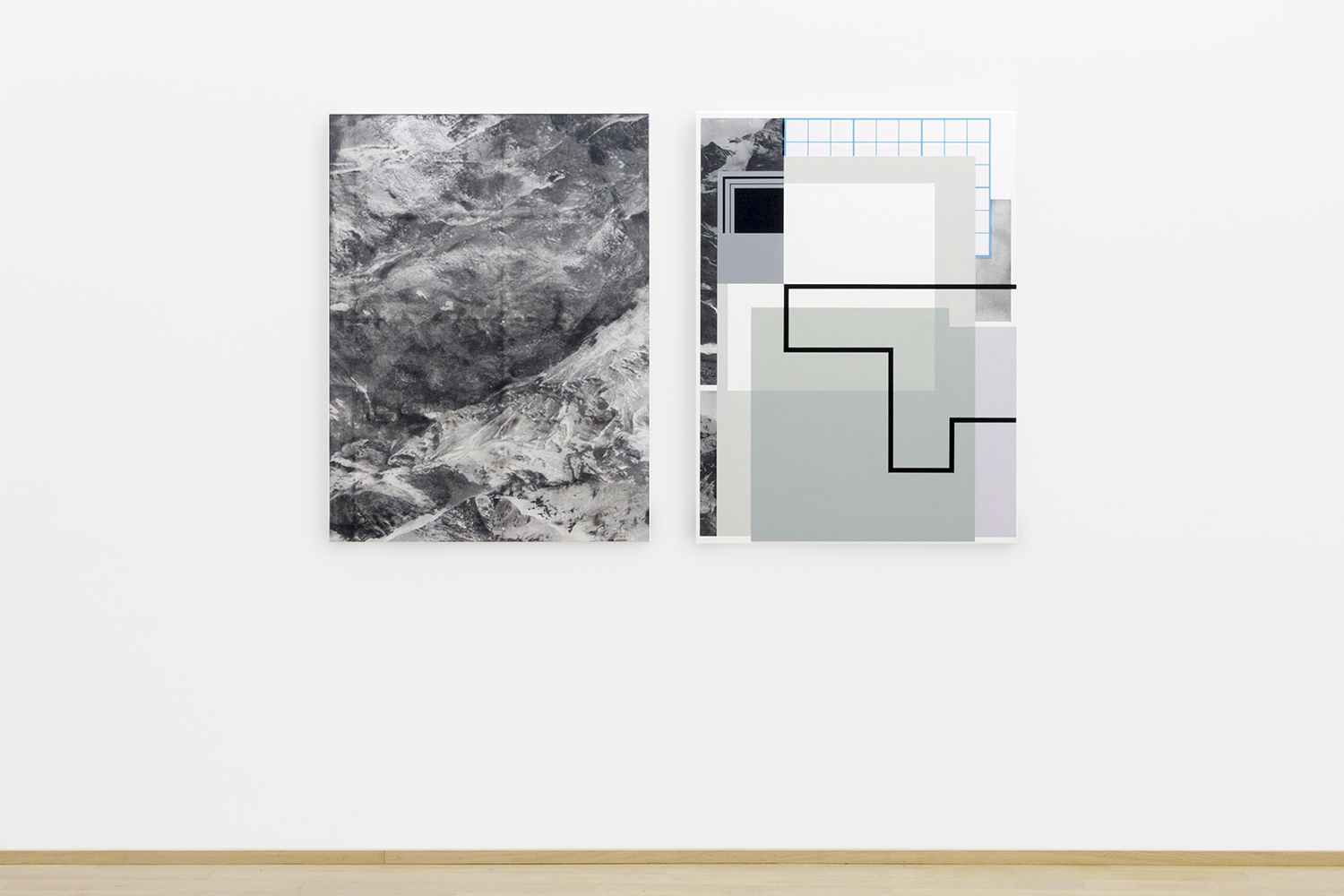 On closer inspection, some geometric motifs in this series may, despite their abstract nature, suggest mountains. For the first time, the artist introduces images (via toner transfer on canvas), which in this case evoke misty mountainous landscapes. Impressed by the meticulous preparation of mountaineers before the ascent and the extreme discipline required during such a feat, the artist pays homage to the mineral, to rock, to climbing and human endeavour. In this fascination with climbing and Alpine landscapes, one can see a parallel with the work of the artist, which is also synonymous with precision and technical accomplishment and is applied to constant research into the forms and objects around us.